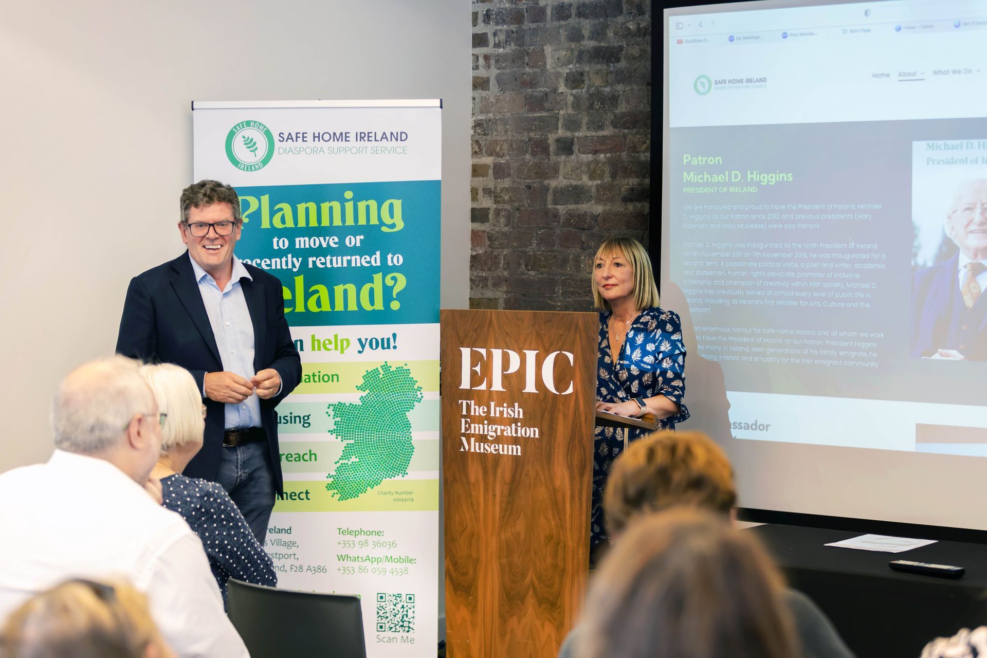 Included in the pictures with President and Sabina Higgins are: Ann Lawler and Paul Reardon of 'Friends of Safe Home Ireland'; Johnny B. Broderick (our Information & Communications Officer); Ann Roddy (Board Director, Treasurer); and Vivienne Woodley of our Returned Emigrant Network.
